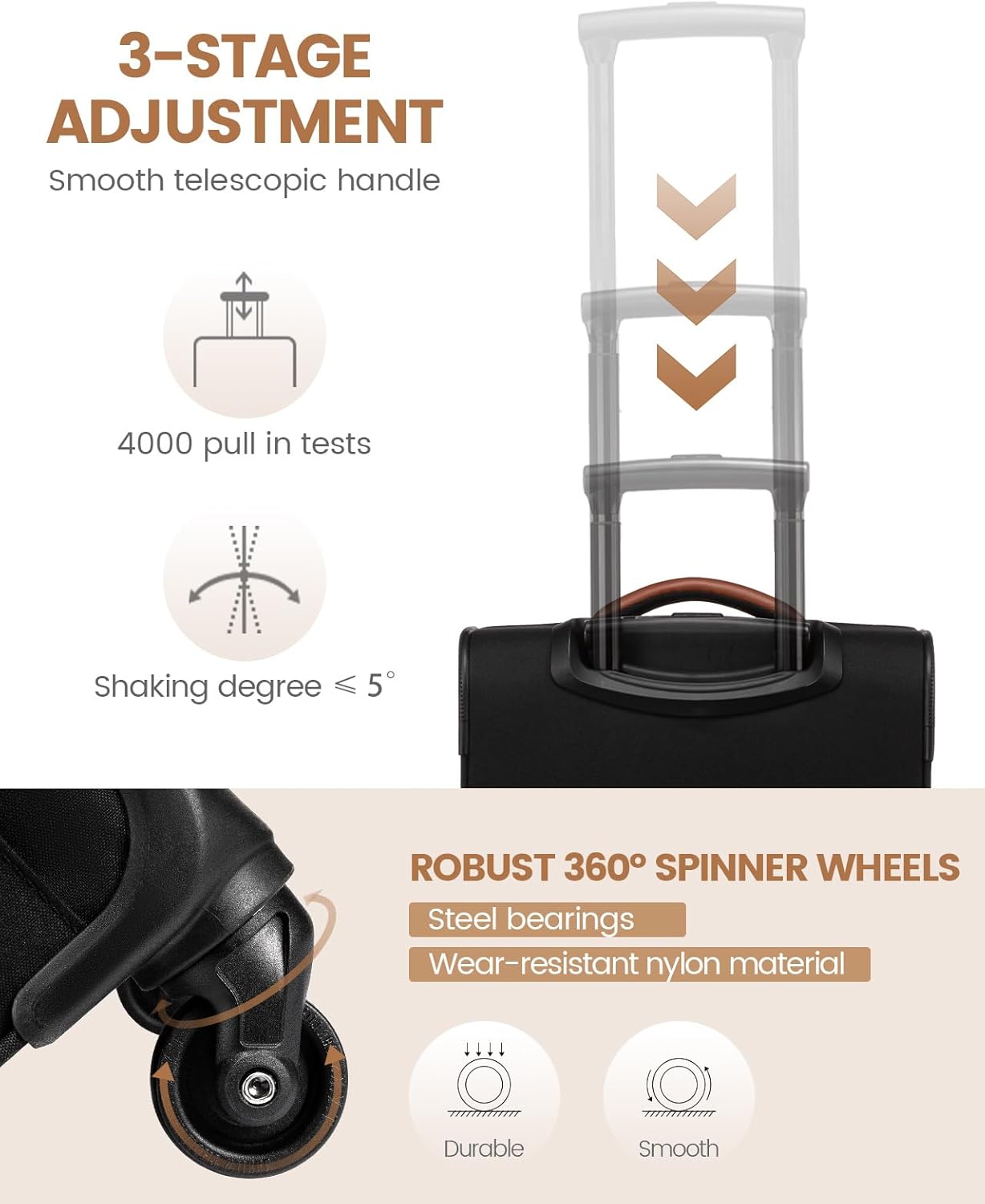 - 【Unübertroffene Haltbarkeit und reibungslose Mobilität】 Dieses weiche Handgepäck besteht aus hochwertigem wasserabweisendem und kratzfestem Polyester mit leicht zu reinigenden Lederakzenten und hält den Strapazen der Reise stand. Die 360°-Rollen sorgen für ein sanftes Gleiten, auch bei vollem Gepäck, während der dreifach höhenverstellbare Griff das Wackeln minimiert und so für einfache Mobilität sorgt.
