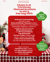 Besuchen Sie mindestens drei weihnachtlich gestaltete Orte und nehmen Sie pro Ort ein Video oder eine Reihe von Fotos auf. Teilen Sie Ihre Inhalte auf Instagram mit den Hashtags #lovevookmoments und #merrychristmas und taggen Sie @lovevook . Um eine kostenlose Lovevook-Tasche zu gewinnen, muss die Gesamtzahl der Likes für alle Ihre Videos 50 erreichen. Sie können jeden beliebigen Stil wählen.