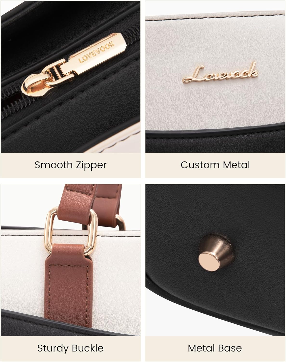 • Upgraded Laptop Compartment: This laptop purse for women, designed for 15.6-inch laptops, features a padded lining for shock absorption, and a velcro for security if this office bag for women tips over. Metal feet prevent wear and scratches. The front pocket has a magnetic snap for easy access, while a back zip pocket secures valuables, and an internal key clip allows quick key access.