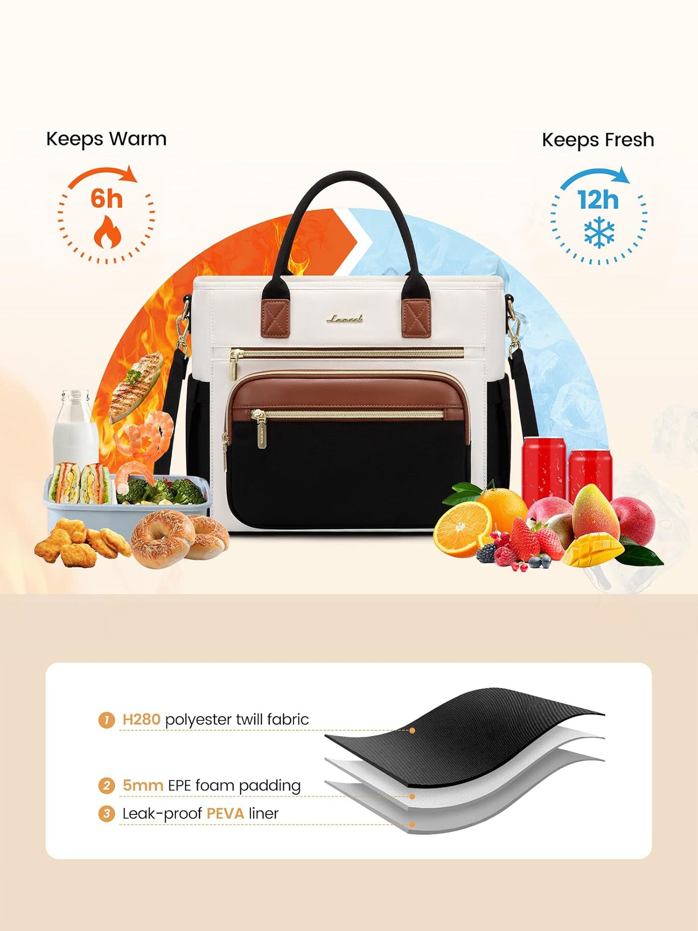 - Long-Lasting Insulation: LOVEVOOK lunch bag adopts three-layer insulation design, the outer layer is wear-resistant polyester fiber, the middle layer is filled with 5mm thick EPE insulation pearl cotton, providing better insulation and cushioning, and the inner layer is environmentally friendly PEVA waterproof material, providing 100% waterproof and leak-proof protection and easy to clean. From morning to night, the insulated lunch bag ensures that your food and drinks always maintain the ideal temperature.