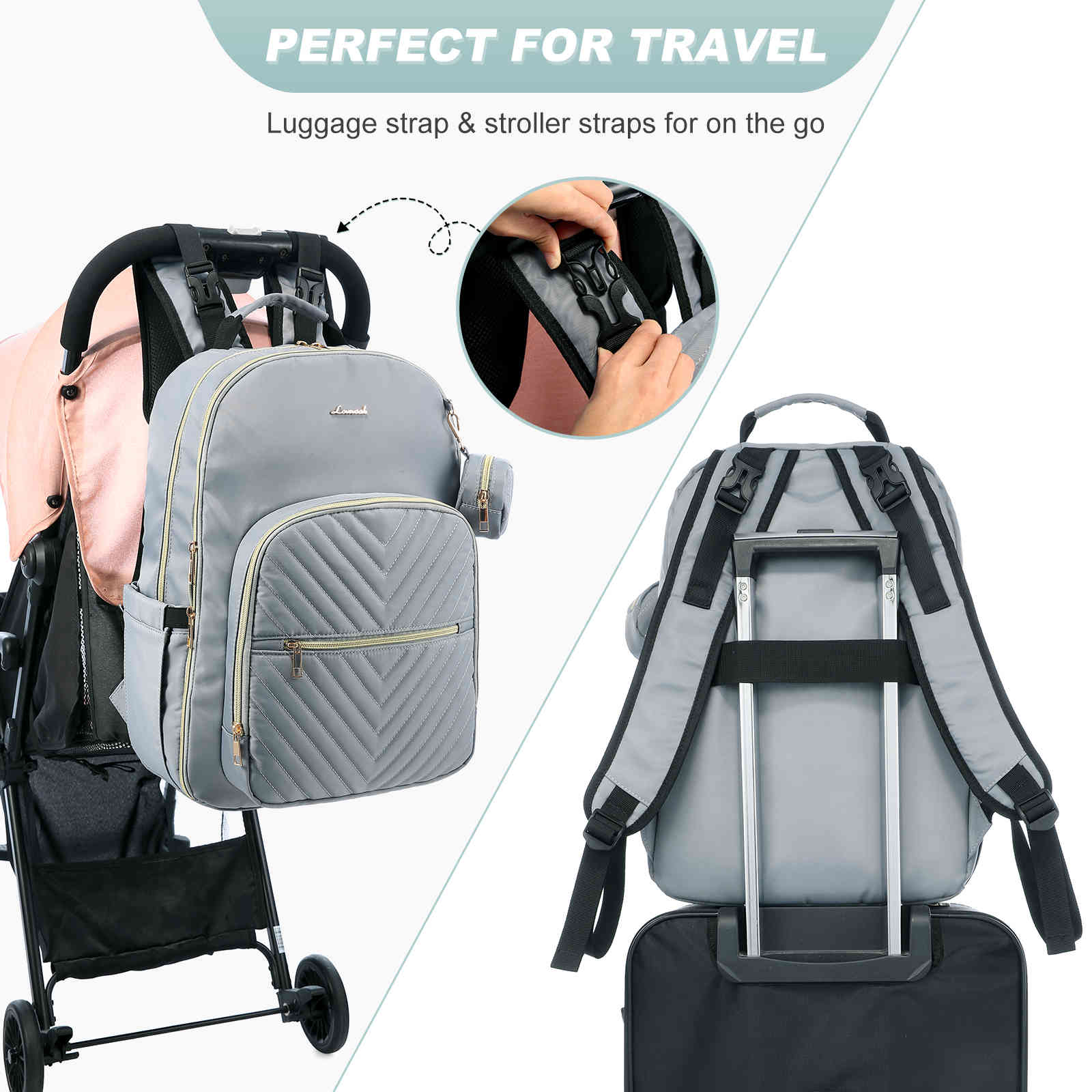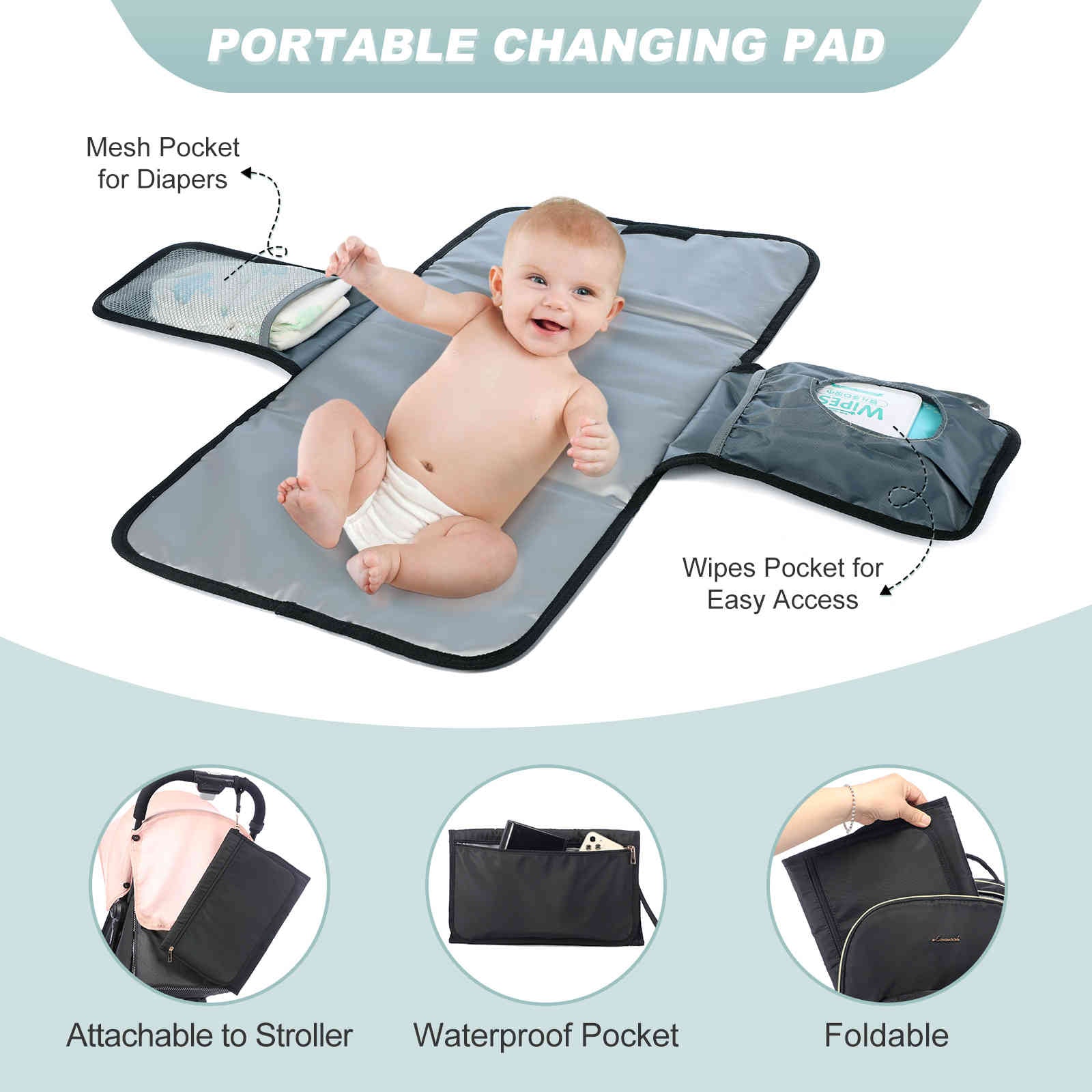 - VERSATILE & CONVENIENT: Baby diaper bag features stroller buckle, back anti-theft pocket and waterproof pocket; Diaper bag with changing pad features pockets for organizing diapers and wipes. Dual zippers make it easy to zip & access with one hand! Built-in 15.6" padding laptop pocket in main compartment for carrying work laptop.