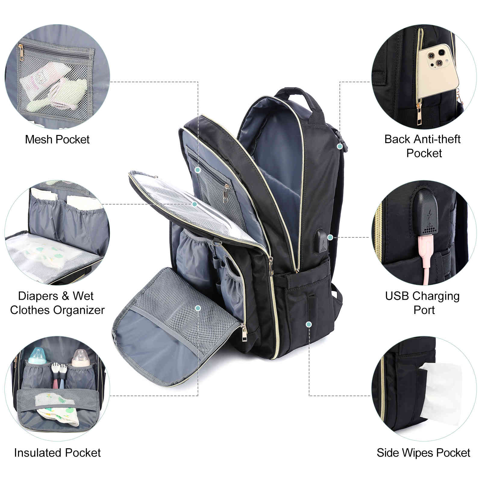 - WELL ORGANIZED: The diaper bag backpack has 18 pockets, 2 insulated holders fts 5 oz to 10 oz milk bottles, 2 side pockets will hold your water bottle and wipes, hidden pocket in the back for stashing phone or wallet, there are so many pockets and neat storage compartments within and outside of the diaper bag is so many configurations to suit parents' needs.